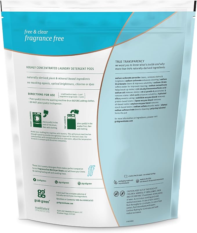 - Contains: 1- 60 Pod Bag of Grab Green Natural Fragrance Free 3in1 Laundry Detergent Pods. Our velcro closure bags are convenient and easy to use, no hassling with frustrating zip closures