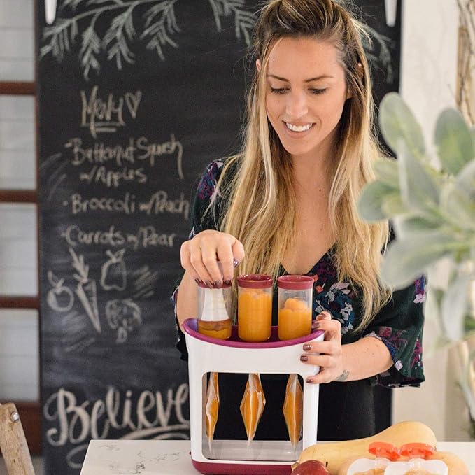 - EFFORTLESS PUREE PREPARATION: Simplify your baby food routine with this all-in-one baby food maker and squeeze pouch system. Designed to help parents store pure, homemade blends with less mess and more control