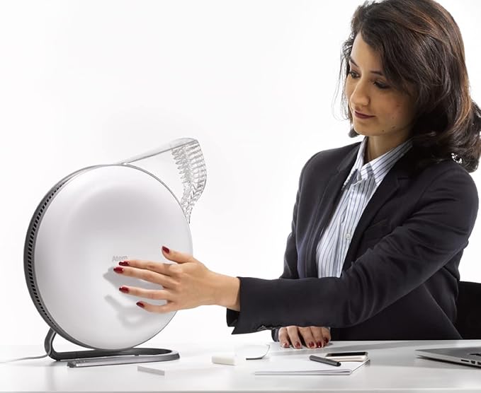 - HYPERHEPA FILTRATION: Atem’s portable air cleaner fans pull mold, pollen, dust, smoke, allergens, pet dander, asthma triggers, and even ultra-fine biocontaminants from the air and creates a zone of safe filtered air around you. Breathe easy all day long.