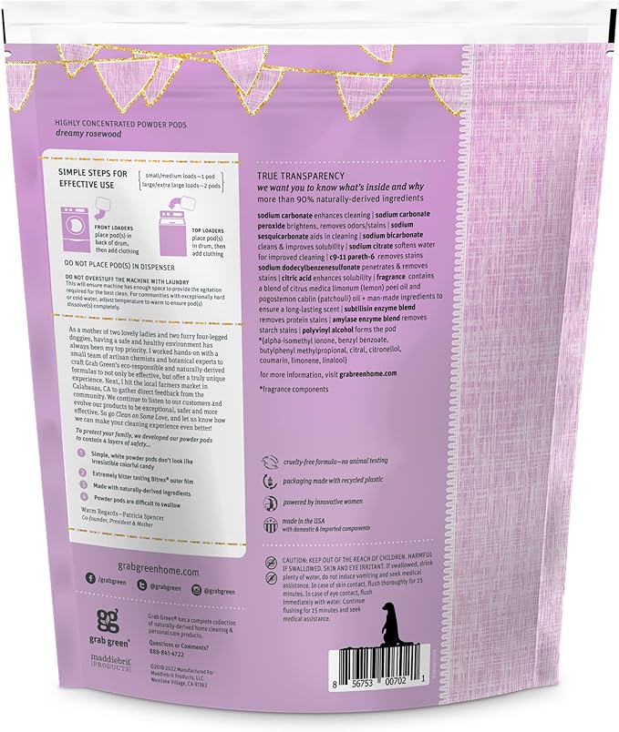 - Contains: 1- 50 Pod Bags of Grab Green Natural Baby Dreamy Rosewood Laundry Detergent Pods. Our velcro closure bags are convenient and easy to use, no hassling with frustrating zip closures