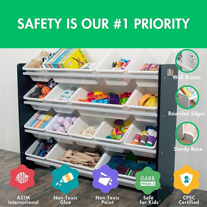 - Supersized Storage Solution: Transform clutter with this 16-bin toy organizer. With 12 standard and 4 large bins, it offers 25% more storage than standard organizers, making it perfect for large toy storage and keeping your kids' space tidy.
