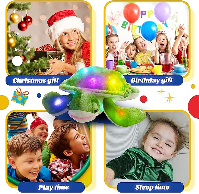 - Adorable Turtle Design β This adorable plush toy features a green turtle design. The colorful light-up tortoise makes a great playmate for both day and night. It's a great gift for children and loved ones for Christmas, Children's Day, Valentine's Day, birthdays, or any other special occasion.