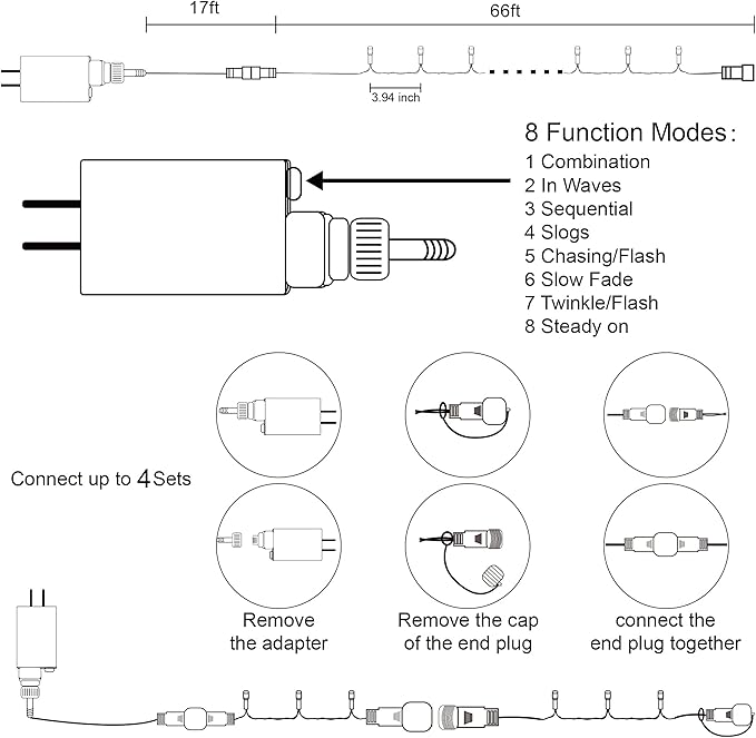 - 8 Lighting Functions with Memory Function: Our fourth July string lights have 8 lighting modes- combination, in waves, sequential, slogs, chasing/flash, slow fade, twinkle/flash, and steady on. Just pressing the round button on the transformer to change the lighting modes. Comes with memory function, will remember last setting automatically after cutting off the power, no need to reset again