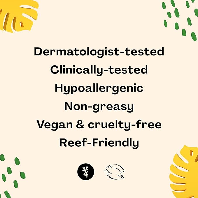 - Product Benefits : Dermatologist Tested, Hypoallergenic, Not Tested on Animals (Leaping Bunny Certified), Reef-Friendly (Biorius Certified), Vegan Dermatologist Tested, Hypoallergenic, Not Tested on Animals (Leaping Bunny Certified), Reef-Friendly (Biorius Certified), Vegan