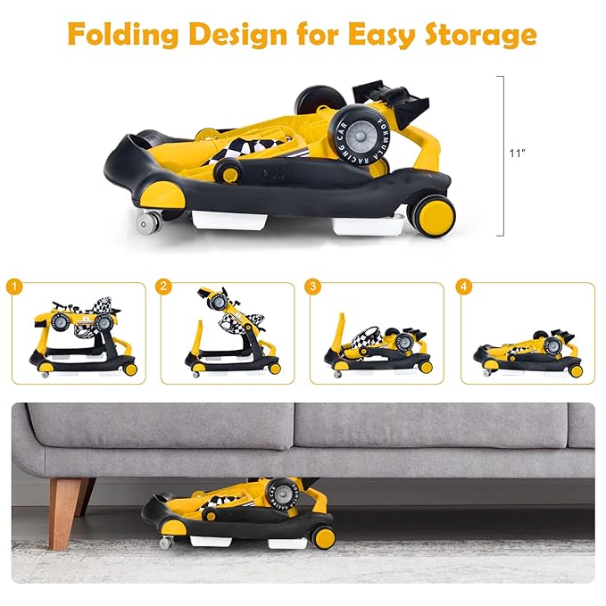 HONEY JOY 4-in-1 Baby Walker, Activity Push Walker w/3 Adjustable Heights, Smooth Wheels w/Adjustable Speed, Padded Seat, Music & Light, Foldable Car Walker for Baby Boys Girls Age 6 Months+ (Yellow)