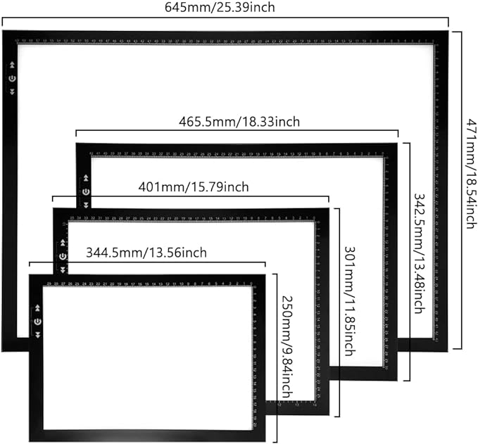 - Easy Carrying -- A4 Size Super Slim Trace Drawing light box with 0.23’’ Aluminum Frame is Sturdy, Light Guide Board make The illumination is perfectly even, super bright, and flicker-free, Overall dimension including Black Frame: 13.56”x 9.84”, Visual area: 12” x 8.27”