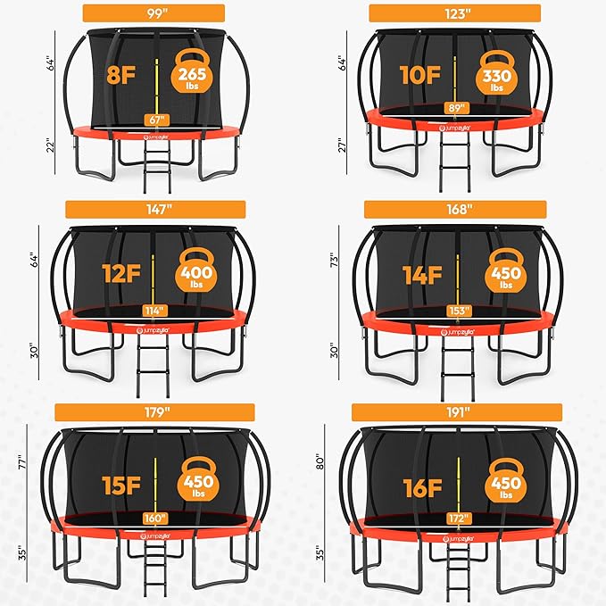 - SIZED FOR EVERY BACKYARD: Whether you have a cozy yard or wide-open space, weβve got you covered. Available in 8 FT, 10 FT, 12 FT, and 14 FT trampoline sizes to fit your outdoor space perfectly. Jump into fun that fits just right.