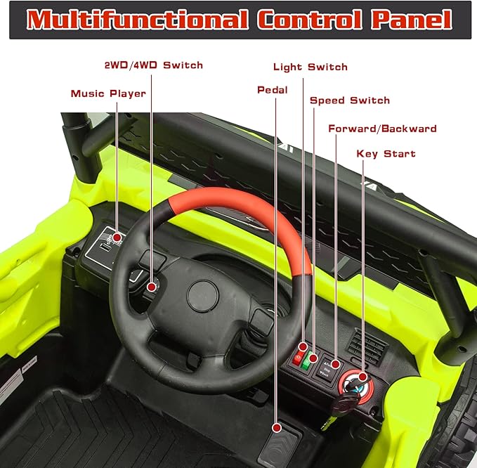 - REALISTIC DRIVING EXPERIENCE- This kids ride on truck has key start design, bright LED lights, horn &engine sounds, adjustable seat belt, lockable doors, foot pedal acceleration, wear-resistant wheels and cool decoration for off-road style, which can attract your kids at first sight