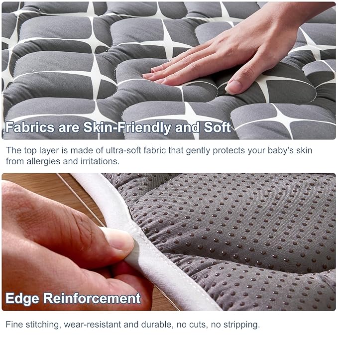 - 【Non-slip, thick and comfort】 The back side of the 59x59 play mat for made of anti-slip material, and the bottom backing is silicone dots. It is thicker than other play mat. It prevents babies from causing pain when they fall or bump.