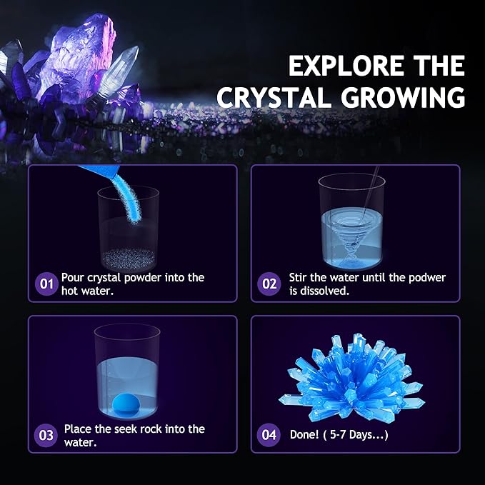- IGNITE YOUR CHILD'S PASSION FOR SCIENCE: Unlock the hidden gemstone inside the rock with a satisfying tap, or marvel at the dazzling crystals inside the geode. There's nothing more thrilling in the world of geology. And that's not all - our stem toys also includes two packs of crystal powder to simulate the mesmerizing process of crystal growth. These magical discoveries and hands-on experiences allow kids to learn scientific knowledge and develop a passion for science, geology,and paleontology.