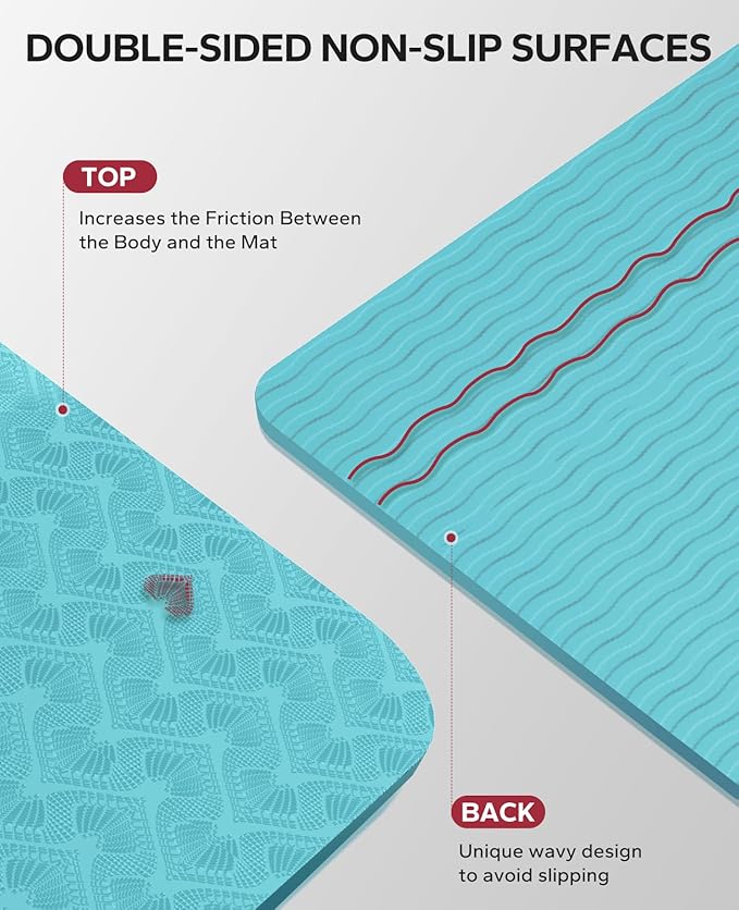 - 𝐃𝐨𝐮𝐛𝐥𝐞-𝐒𝐢𝐝𝐞𝐝 𝐍𝐨𝐧-𝐒𝐥𝐢𝐩 𝐃𝐞𝐬𝐢𝐠𝐧: Our extra wide yoga mat features a double-sided non-slip surface to keep you stable and secure during your practice without worrying about slipping or sliding. The unique wave pattern on the bottom enhances grip on a variety of surfaces, ensuring your mat stays securely in place even during the most challenging yoga poses. Note:Not for use on carpet