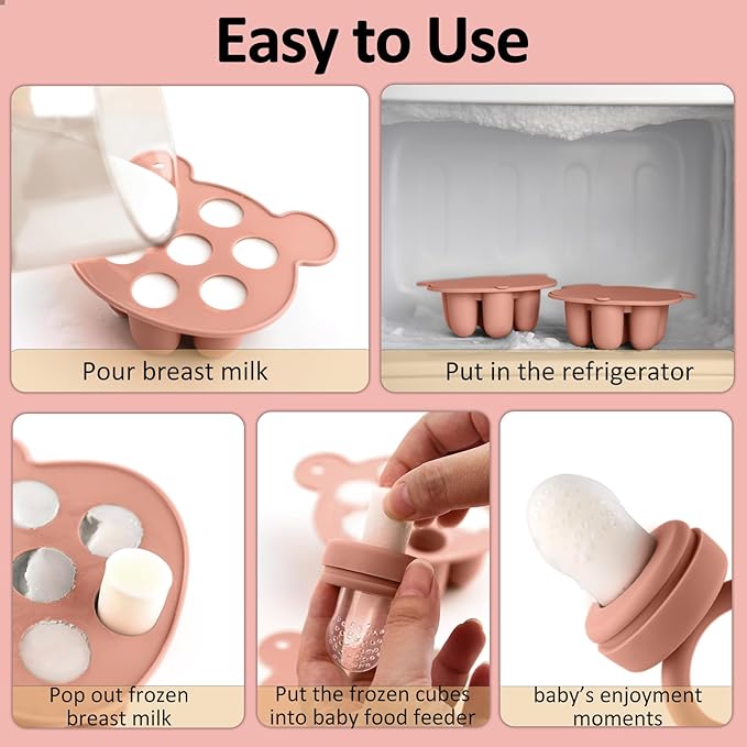 - [More Convenient - Baby Food Feeder + Popsicle Molds!] This Set of Bear baby food freezer tray + baby fruit food feeder is the perfect solution for quick meal prep and feeding. With this baby popsicle molds you can prepare baby food, purees, breastmilk, and more in batch and in advance. Then you just put them into baby feeder, everything is done. Pefect for teething babies with sore gums.