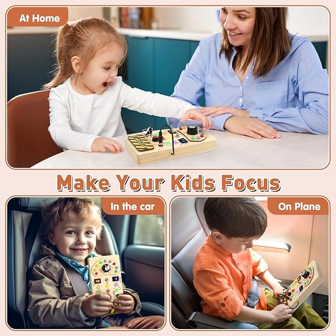 - [High Quality] Our fidget Board is made of eco-wood, smooth product edges and perfect size for the toddlers little hands. Soft light will not hurt the eyes of children and Inside the busy board is a professional circuit board, durable and safe.
