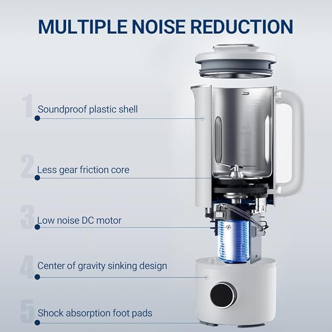 - MULTIPLE NOISE REDUCTIO - Five steps of noise reduction in Cooking Blender: Soundproof plastic shell, Less gear friction core, Low noise DC motor, Center of gravity sinking design, Shock absorption foot pads. Soft sound wall breaking that won't affect your family and neighbors.