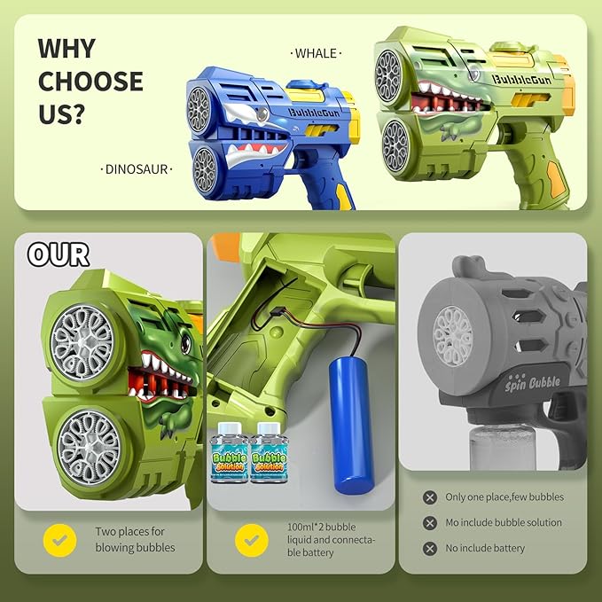 - Upgrade 2 Dinosaur Bubble Gun - The newly upgraded bubble holes, pull the trigger, are full of power, and bubbles are produced crazily. Thousands of bubbles can be produced every minute, doubling the fun! This bubble machine box contains two bubble machine guns of different colors, and the cute dinosaur shape makes children put it down