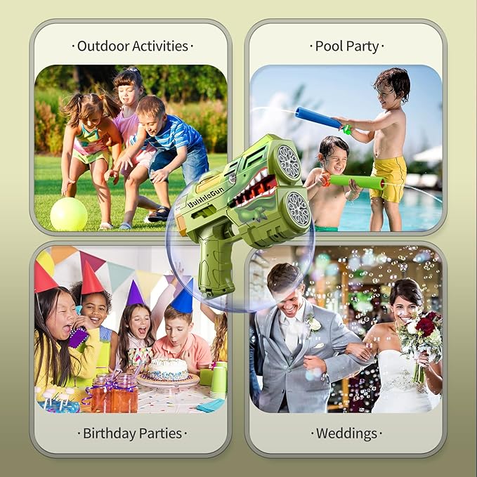 - Ideal Gifts for Any Occasion - The toddlers bubble maker comes in a beautifully packaged box with complete accessories . It is the perfect gift for kids toddlers over three years old. The bubble gun blaster also makes a great bubbles toy bag for these indoor and outdoor occasions, perfect for theme parties, carnivals, birthday parties, camping trips, Halloween, weddings, school classrooms, Easter baskets, outdoor water toy play activities, beaches, backpacking, backyard Bubble party etc.