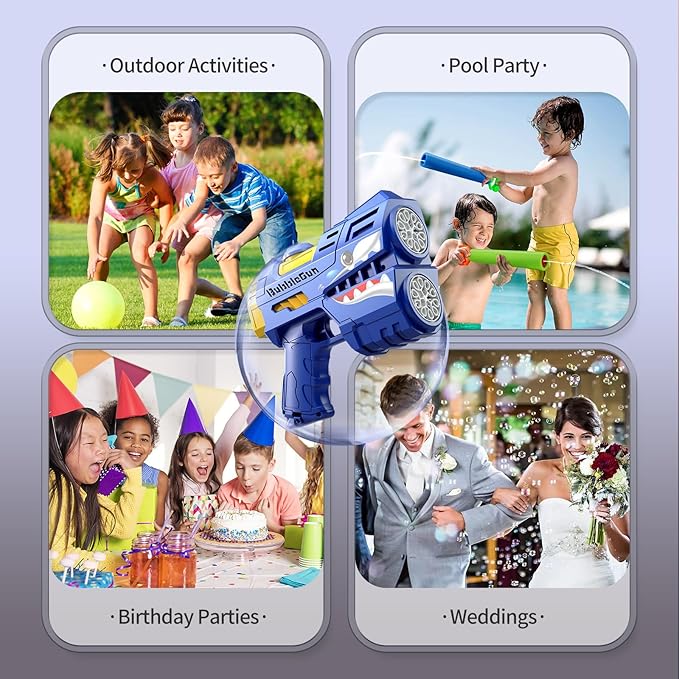 - Ideal Gifts for Any Occasion: The toddlers bubble maker comes in a beautifully packaged box with complete accessories . It is the perfect gift for kids toddlers over three years old. The bubble gun blaster also makes a great bubbles toy bag for these indoor and outdoor occasions, perfect for theme parties, carnivals, birthday parties, camping trips, Halloween, weddings, school classrooms, Easter baskets, outdoor water toy play activities, beaches, backpacking, backyard Bubble party etc.