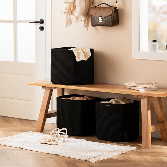 joybest Cube Storage Bins Set of 4, 13inch Cube Baskets Organizer for Nursery, Square Cotton Rope Baskets for Shelves Organizing, Kids Toy, Closet Storage, Black