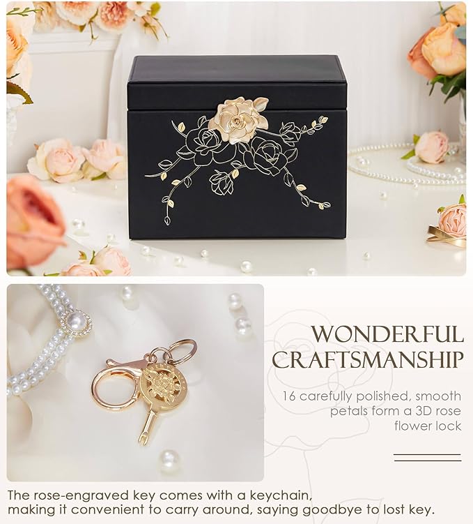 - Secure Storage with Elegant Leather: A jewelry box that locks, keeping your treasures secure with a rose lock and beautiful faux leather that adds a touch of luxury to any room.