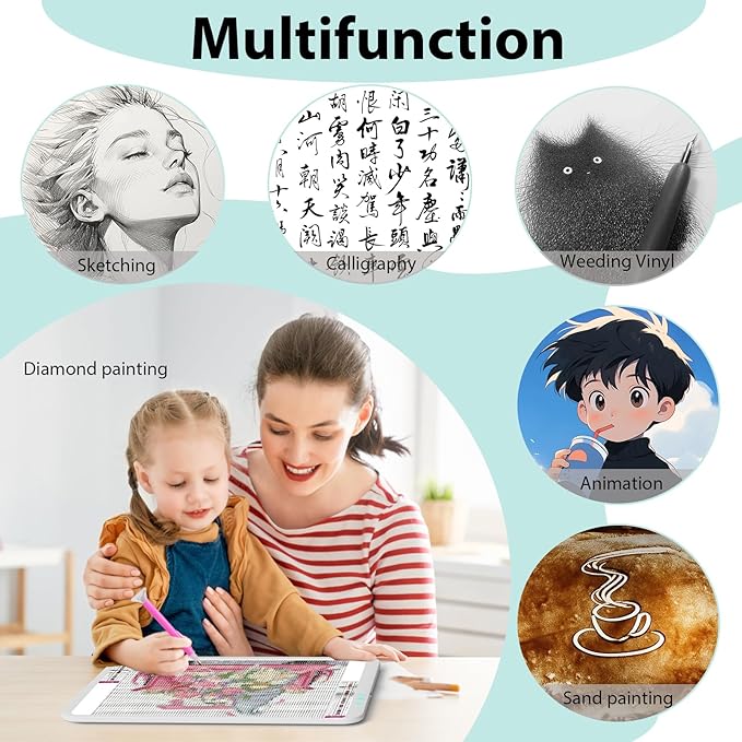 - <๐๐ฎ๐๐ต๐ถ๐ผ๐ป๏ผ๐๐ถ๐ด ๐๐ฏ>: The diamond art light pad boasts a chic design in white and mint green, radiating modernity and sophistication, enhancing the visual appeal of the device while infusing a sense of freshness and sophistication into any workspace.And the light pad is designed to be highly portable with L16.2''รW12.2''รH0.3''.The visual working area is 14.8''x10.6'',which is much bigger than A4 size,perfect for diamond painting and drawing.lt's a perfect gift for Christmas, birthdays or any other festivals.