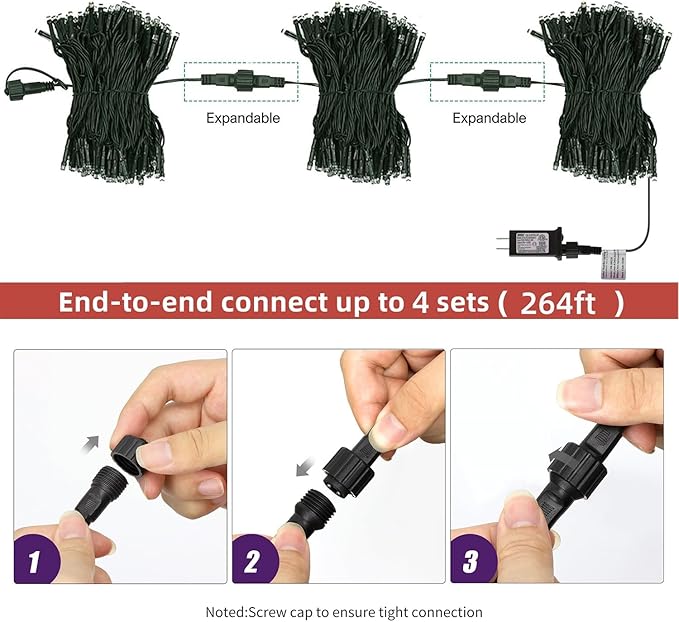 - 8 Lighting Functions with Memory Function: Our Christmas string lights have 8 lighting modes- combination, in waves, sequential, slogs, chasing/flash, slow fade, twinkle/flash, and steady on. Just pressing the round button on the transformer to change the lighting modes. Comes with memory function, will remember last setting automatically after cutting off the power, no need to reset again