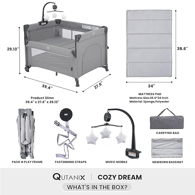 - VERSATILE 2-IN-1 BABY BASSINET & PACK AND PLAY - Starts on a parenting journey with Qutanix 2-in-1 Baby Bassinet & Pack n play Combo,it transforms from the intimate bedside bassinet sleeper to the versatile baby playpen and dual-functionality standalone baby crib - Qutanix Pack and play adapts seamlessly to every stage of your parenthood, ensuring your babyβs safety and comfort at each stage.
