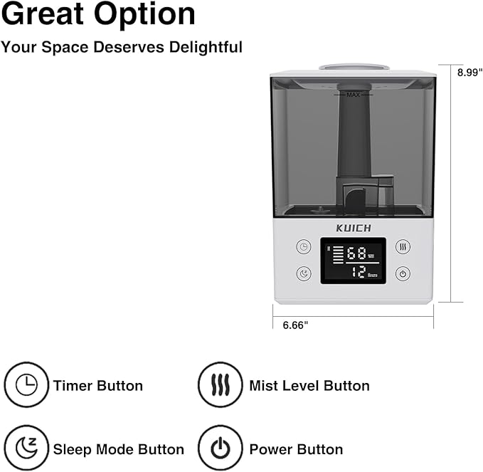 - 【Compact 2.4L Water Tank】- This ultrasonic cool mist humidifier employs a higher frequency ultrasonic misting technology with an oscillation frequency of up to 2.4MHz. That in a finer and more delicate cool mist with improved diffusion. Effectively regulating air humidity, it operates continuously for up to 25 hours in rooms not exceeding 180 square feet. Maintain a stable and healthy environment, bid farewell to sleep disruptions caused by nasal congestion, coughing, or dry mouth. Ideal for bedrooms, nurseries, offices, and indoor plants.