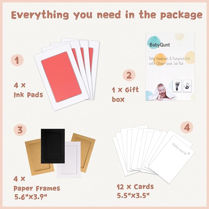 - 【Product Details】: Our baby hand and footprint kit measures 5.0"x3.2" with an ink window of 3.7"x2.3", which is the best size for recording hand and footprints of newborns 0-6 months old or pet paw prints . The ink pad for baby hand and footprints includes 4 clean touch ink pads, 12 stamping cards, and 3 display frames, ensuring you have ample opportunity to capture the best stamp.