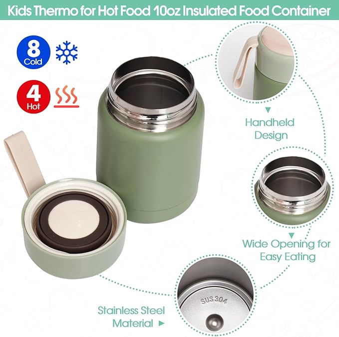- The food thermos measures 3.3 x 5.1 inches and the insulated food jar has a 10 oz capacity, big enough to hold your delicious soup or beverage. The insulated food jar is made of food-grade 304 stainless steel, which has good heat insulation and cold preservation properties.