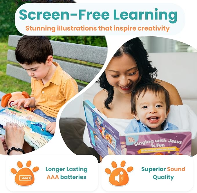 - Interactive Fun with 2 Volume Control Options: With 10 easy-to-press sound buttons, little hands can explore their favorite songs. The 2 volume control settings allow a gentle listening experience, making this talking book for toddlers 1-3 ideal for any environment.