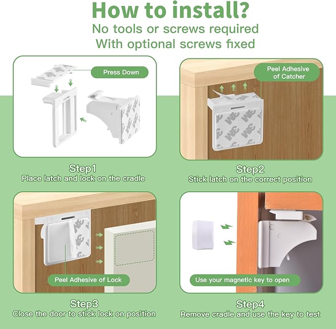 - [ KEEP YOUR BABY SAFE ] Protect your child from dangerous tools or chemicals with Vkania’s magnetic cabinet locks. These baby proofing cabinets locks are easy to install—just peel and stick. Enjoy peace of mind knowing your curious toddler is safe with these reliable baby locks for cabinets.