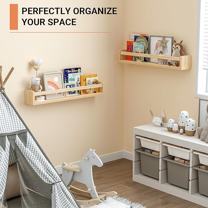 - [Ample Storage Space] - Measuring 24 inches, these nursery shelves offer ample room for organizing children's books, toys, photos, and other small items. They encourage a love for reading while keeping spaces tidy. With 0.6โ thicken panels, each bookshelf can hold up to 30 LBS