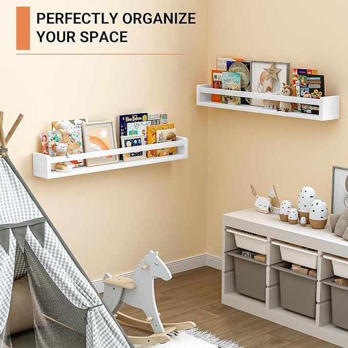 - [Ample Storage Space] - Measuring 31.8 inches, these nursery shelves offer ample room for organizing children's books, toys, photos, and other small items. They encourage a love for reading while keeping spaces tidy. With 0.6โ thicken panels, each bookshelf can hold up to 30 LBS