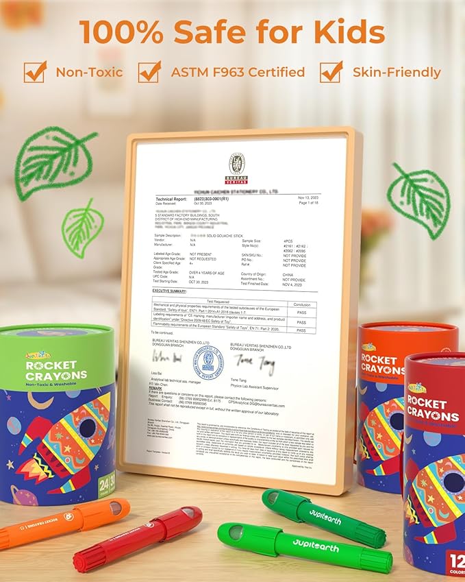 - Non-Toxic & Twist: Our non toxic crayons are safe for toddlers 1-3, 2-4, 4-8 and certified to meet ASTM F963-16/17 and EN71-3 standards. Our washable crayons clean easily from skin, furniture, walls, and clothing, making creativity worry-free at home