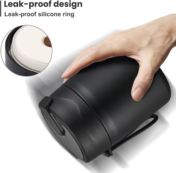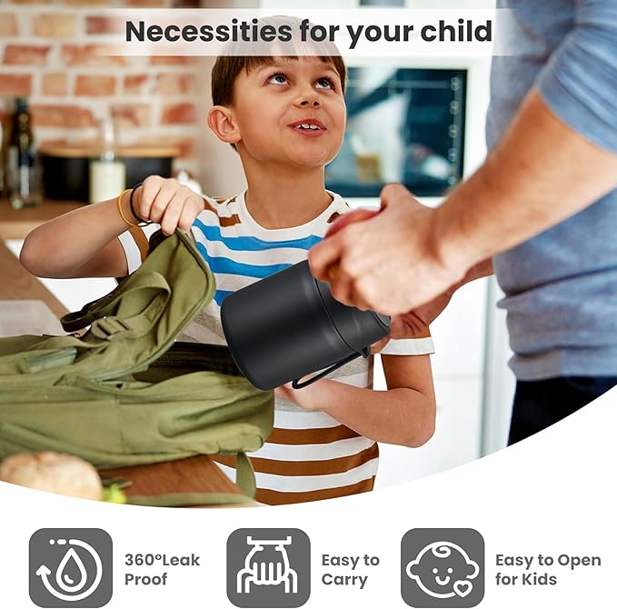 - Leak-Proof Design: Featuring an upgraded double-layer silicone seal that provides a 360Β° leak-proof guarantee. Rest assured that our leak-proof thermo food jar can fit in your lunch bag without worrying about spills. The insulated thermal food jar comes with a stainless steel spoon for your child's convenience.