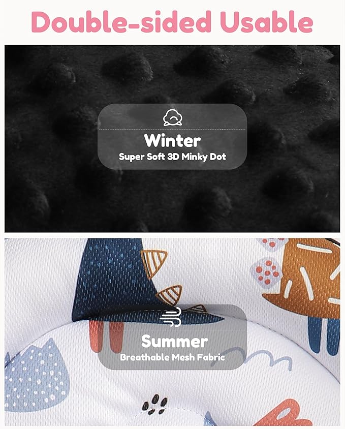 - Double-Sided, Comfort for ALL Seasons: Soft Minky Dotted Plush fabric on front side (cozy for winter) + breathable mesh fabric on back side (cool for summer). Adorable prints stimulate sensory development. Gentle on skin and perfect for road trips, park walks, or indoor rocker