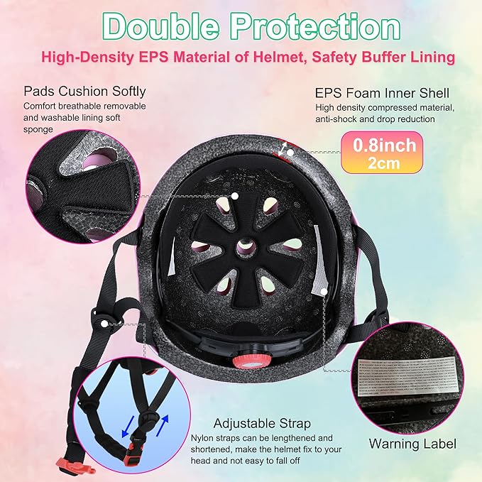 - 【Impact Resistance Girls Helmet】 Sport child youth helmet for kids is made of impact-resistant ABS shell and high-density EPS foam, sturdy and double protection. The internal soft padding can absorb sweat and reduce impact, it also can be removable, so you can clean it by yourself. The toddler bike helmet has 11 ventilation vents which keep kids cool and comfortable during multi-sports.