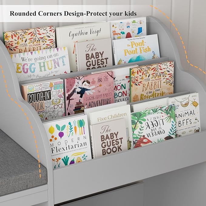 - 4-in-1 Bookshelf: This versatile masterpiece seamlessly integrates storage cubbies, a book rack, a mobile toy box, and a comfortable cushioned seat, forming an organized and joyful play area for your child while offering convenient access to books and toys to keep the space tidy