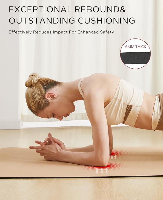 - 6mm Thick for Joint Support:This thick yoga matโs 6mm design cushions joints during yoga, Pilates, and home workouts. The dual-layer structure absorbs impact, reducing pressure on knees, wrists, and elbows for comfortable, long-lasting sessionsโperfect for the supportive cushioning your practice needs