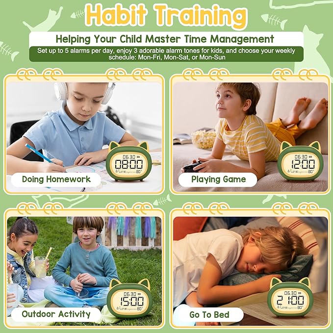 Kids Alarm Clock with Night Light for Kids, Small Digital Alarm Clocks for Bedrooms, Routine Builder, Cute Cat Alarm Clock with Sleep Training, Snooze, 12/24H, Date & Day, Temperature, USB Port