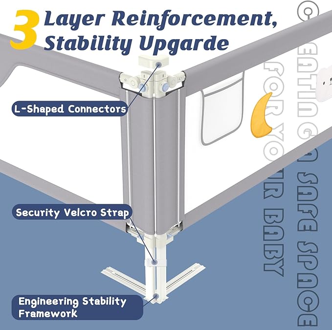 - Additional stability support design: The 3-piece bed rail for baby comes with a headboard for additional support to enhance stability; Improper installation or a mismatched bed frame type can cause stability issues, so be sure to follow installation guidelines and measure your mattress size carefully to ensure compatibility; If you need help, our customer support team is on hand to provide practical advice and troubleshooting services