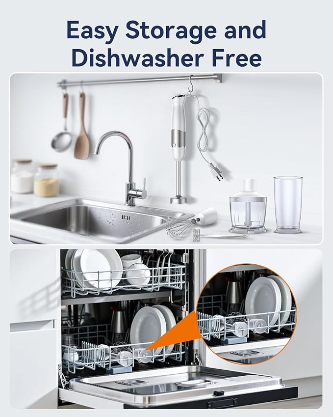 - Easy to Clean: The snap-on/off detachable attachment design makes this emulsifier blender easy to connect and disconnect and a breeze to clean as they all comes off easily than a regular blender. You can just rinse it off after use or wash it in dishwasher. It can hang with the hook and the main body can easily be cleaned by wiping with a soft damp cloth. (except blender shaft and chopping bowl lid requires hand wash and the water temperature of the dishwasher should be below 75ยฐ).