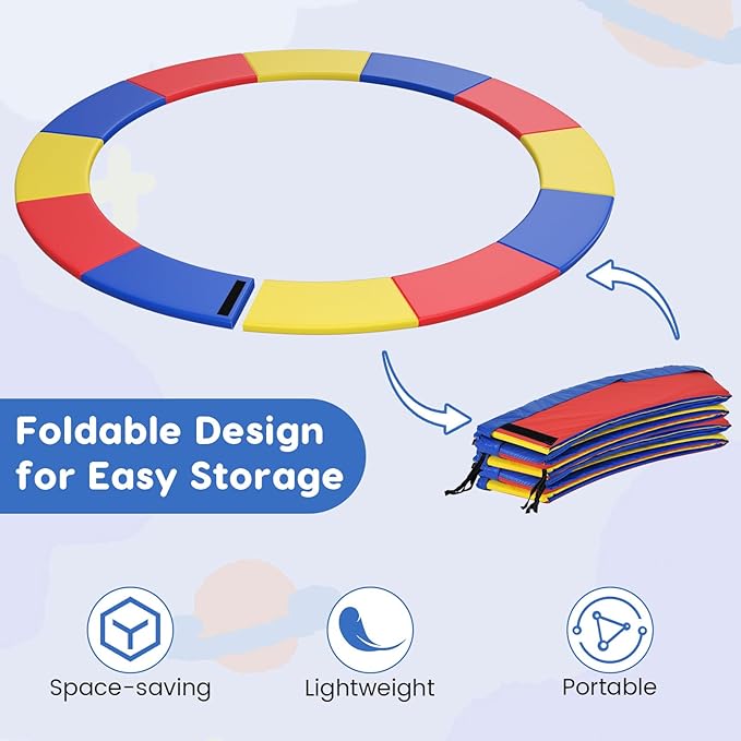 - [Foldable Design]: Thanks to the folding design, this trampoline safety pad is easy to store after use without taking up much space. Meanwhile, the lightweight and portable design allows you to easily carry it to your destination.