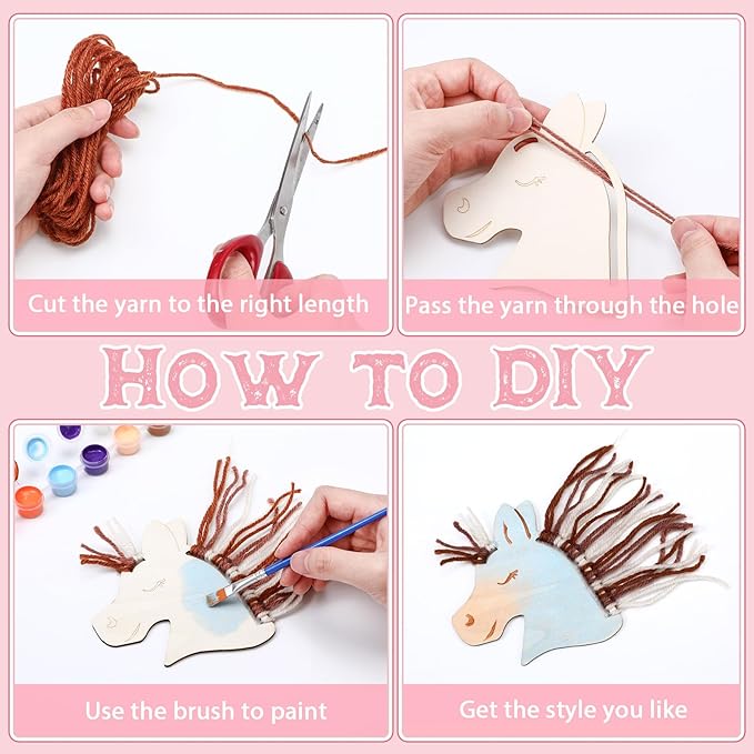 - 24 Set Wooden Horse Cutout Kit: unleash your imagination with this complete wooden horse craft kit; It includes 24 unfinished horse cutouts, 2 sets 12 color paints, 4 paintbrushes, 8 rolls of yarn in different colors, ready to be transformed by your creativity
