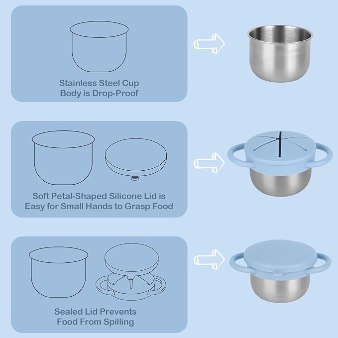 - 3-In-1 Spill-Proof Design: Our toddler snack cups no spill features a unique 3-in-1 design, specially designed for busy toddlers and even busier parents. It comes with a durable stainless steel base and a soft petal-shaped silicone lid, allowing little hands to easily grab snacks and preventing food from spilling everywhere. The included leak-proof travel lid locks in freshness and prevents leaksβno more worrying about messes on the couch, in the car, or in your bag!