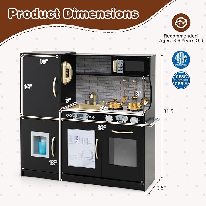 - 【ASTM & CPSIA Certified & Child Secure Design】Made of solid MDF material, this toy kitchen sets is stable and sturdy for long service life. What’s more, the equipped anti-toppling device attaches the kids play kitchen to the wall tightly, avoiding accidental falling.