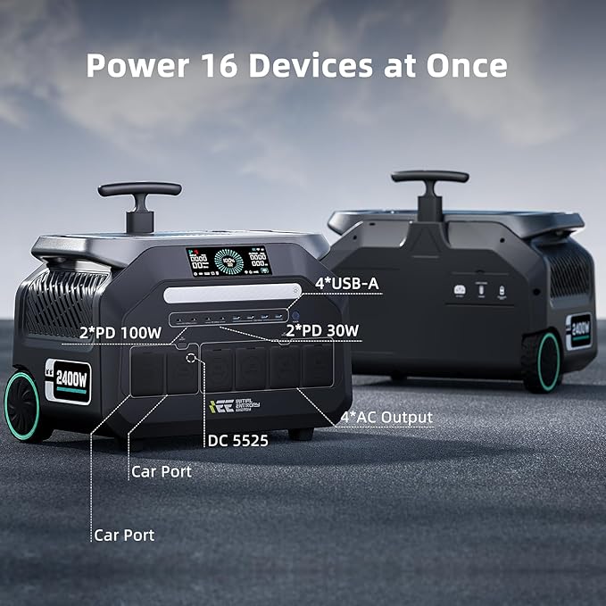 - 【Power for Home and Outdoor Adventures】With 2048Wh capacity and 2400W rated output, this station can power up to 99% of your devices through multiple ports: 4 AC outlets, 4 USB-A ports (30W), 2 fast-charging Type-C ports (100W), 2 standard Type-C ports (30W), 2 DC outlets, and 1 car cigarette lighter port. It’s a reliable solution for home use, outdoor activities, RV life, DIY projects, or job sites—compatible with phones, laptops, tools, kitchen appliances, car gear, and more.